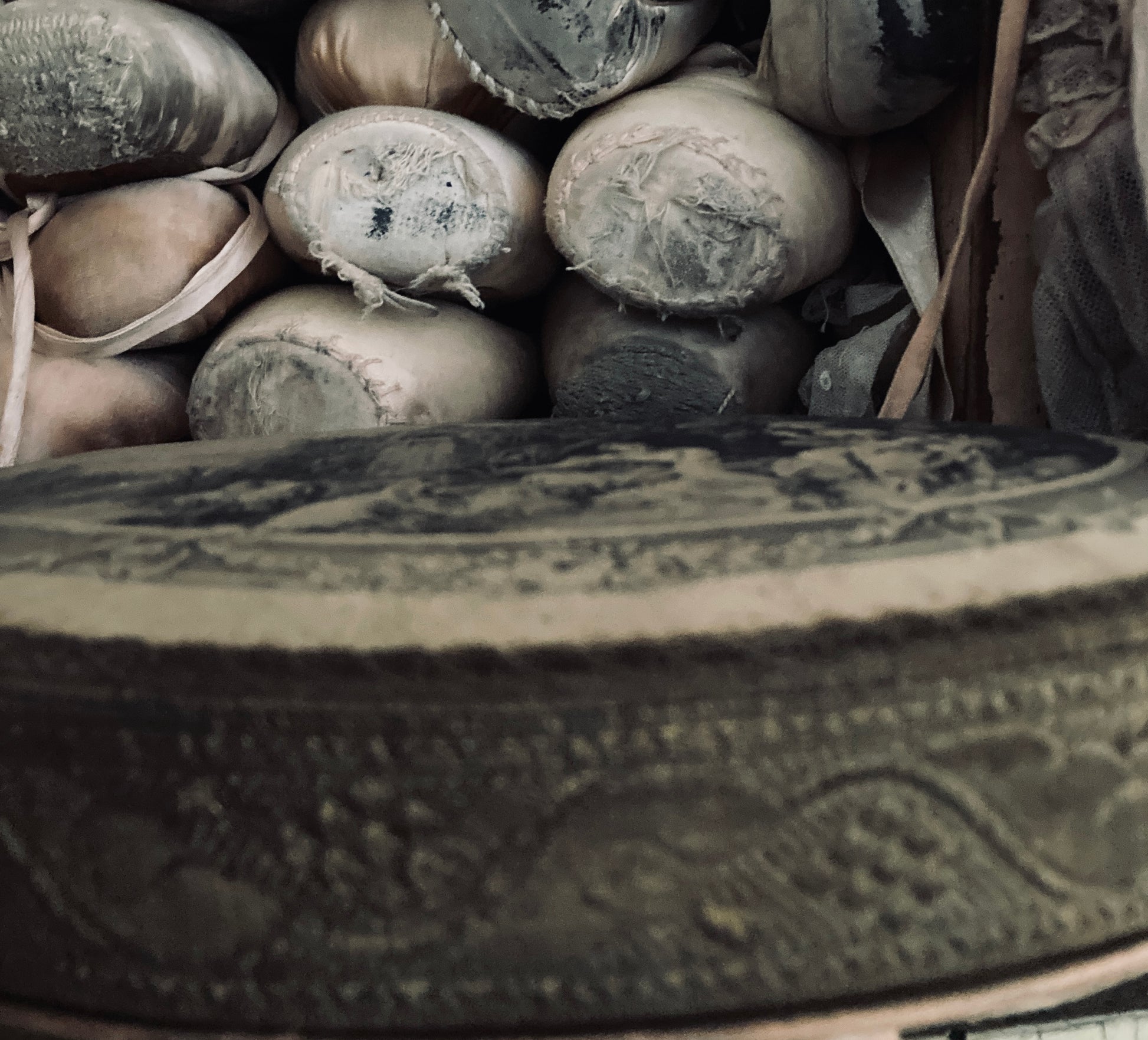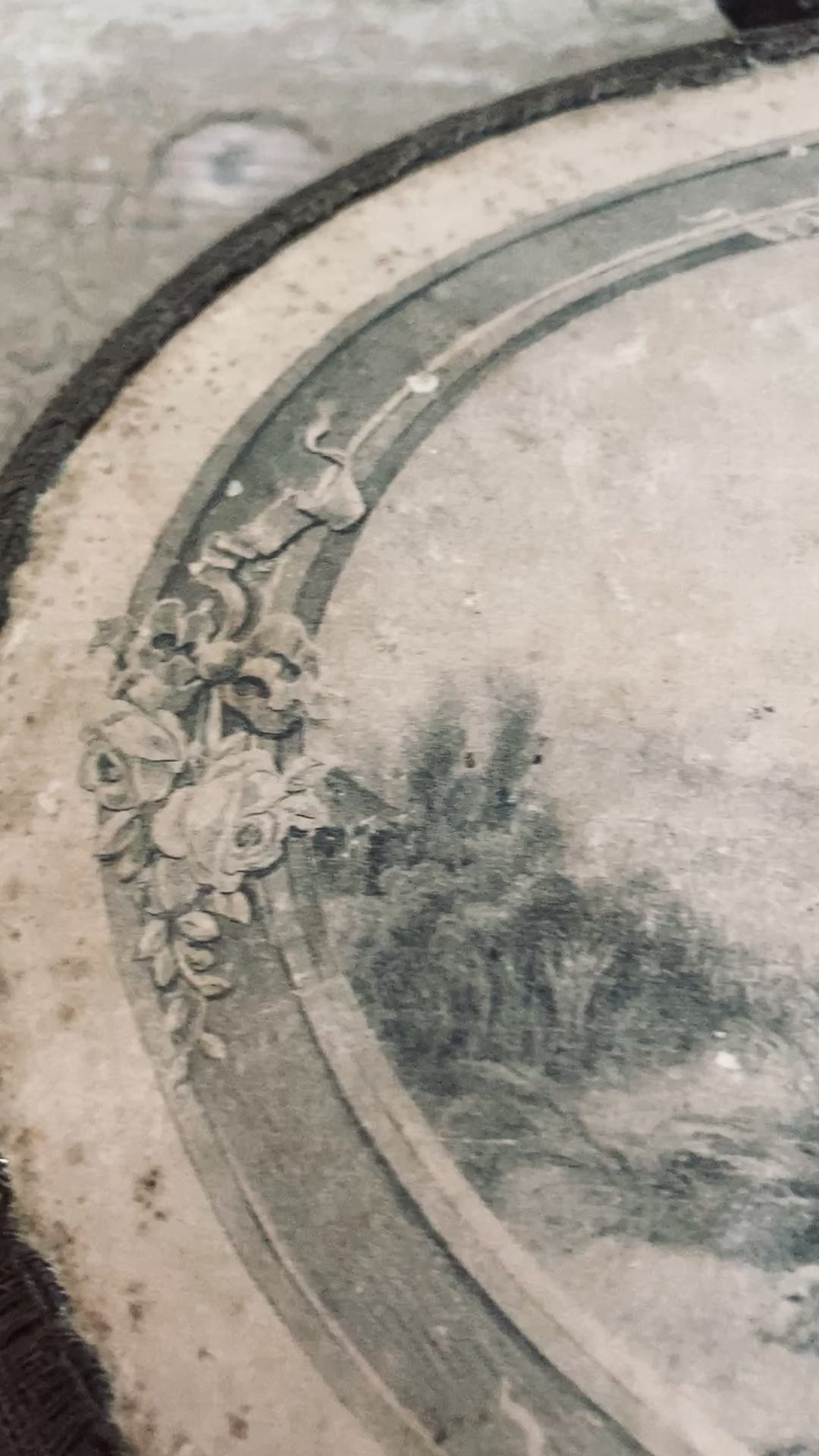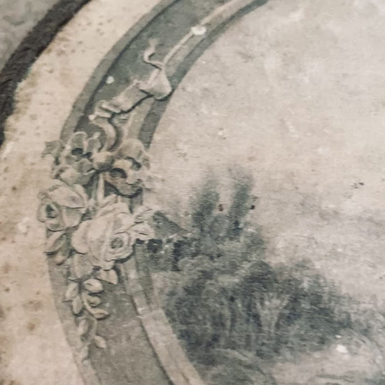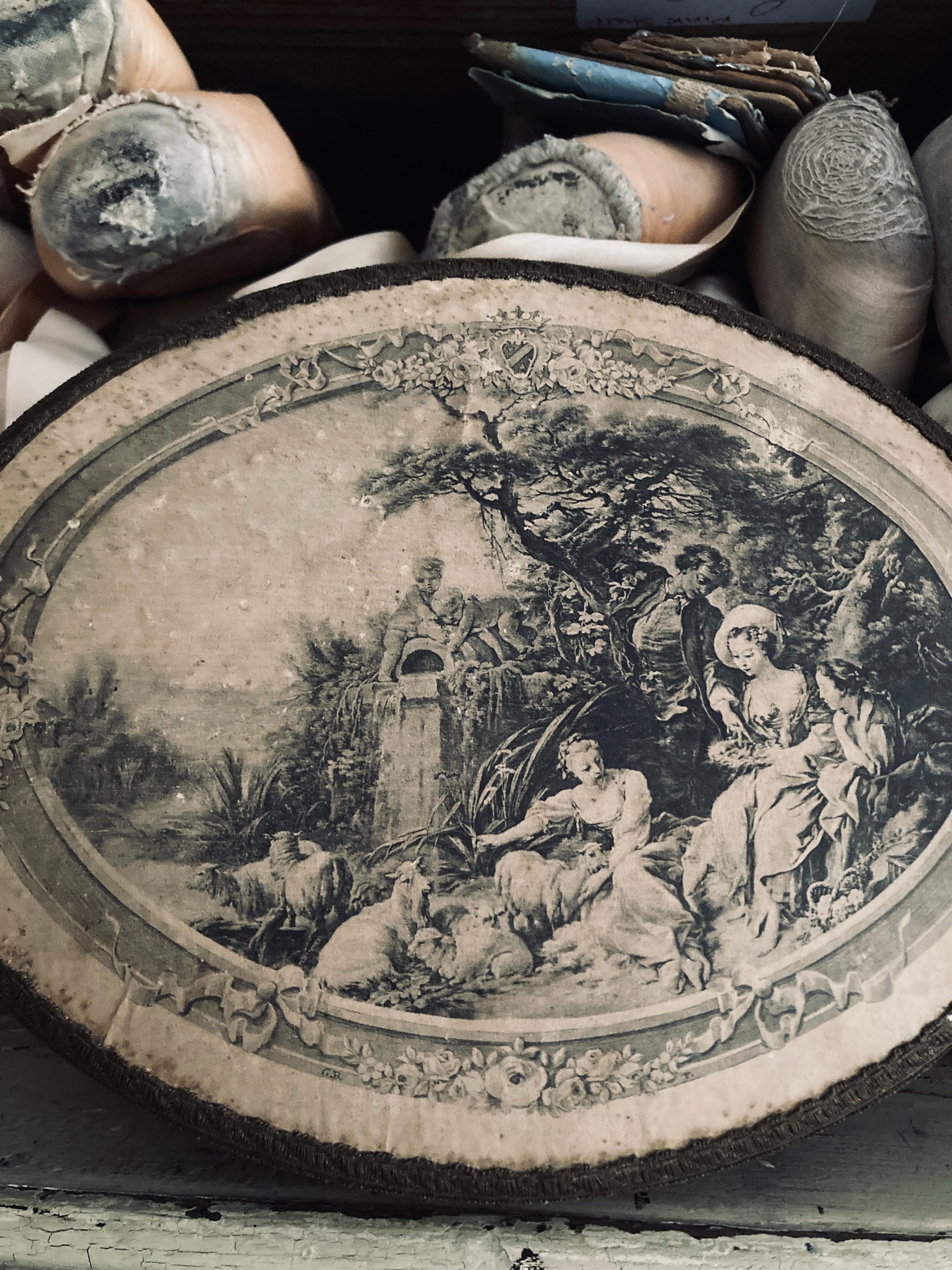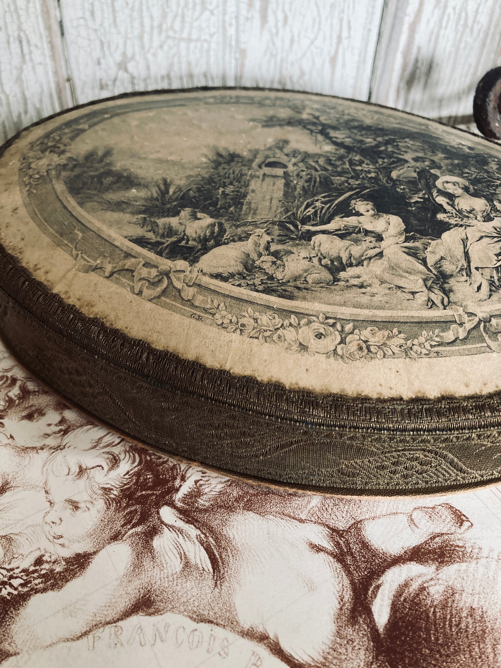 A simply charming french oval bon bon box edged with nineteenth century bronze wire passementerie. The scene on the box is so pretty. I adore the nest of birds madame holds. Lovely condition and the perfect brocante box to fill for she who has everything at Christmas.
