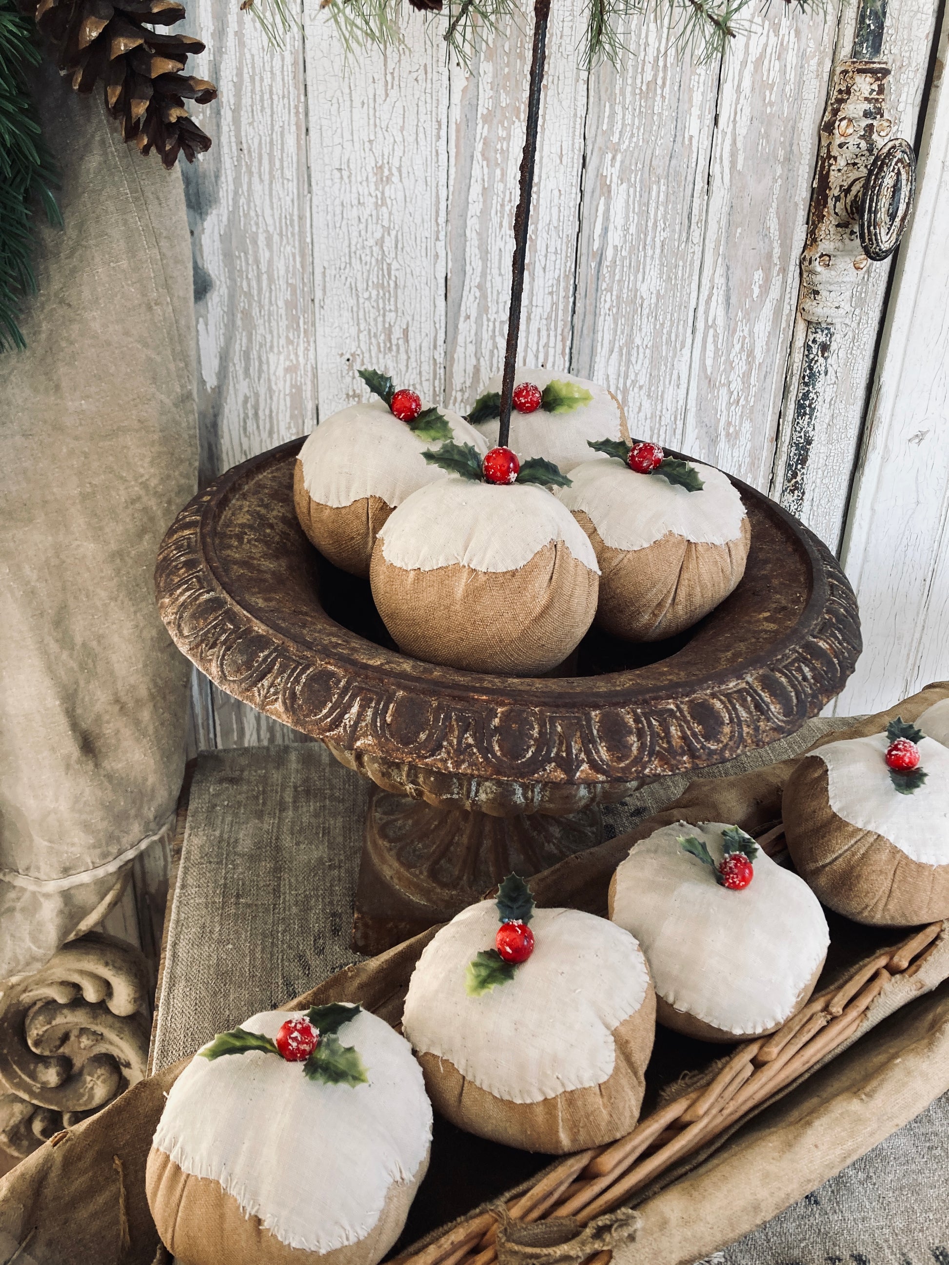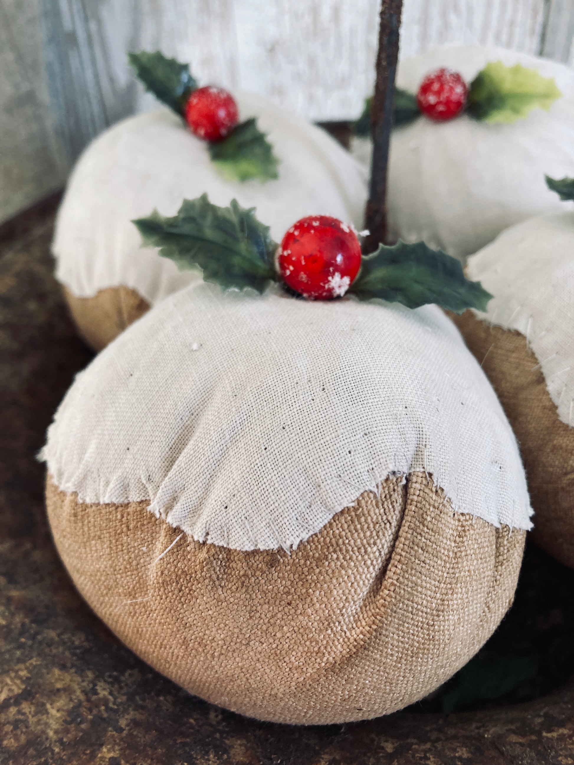 This is my last batch of christmas puddings for sale. Handmade with antique linens for your rustic home decor. Perfect for christmas table settings, sitting on a cake stand or old books. Vintage Christmas delights.