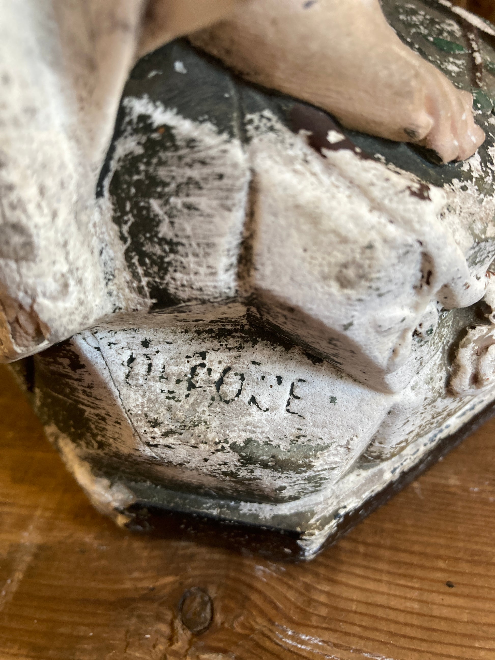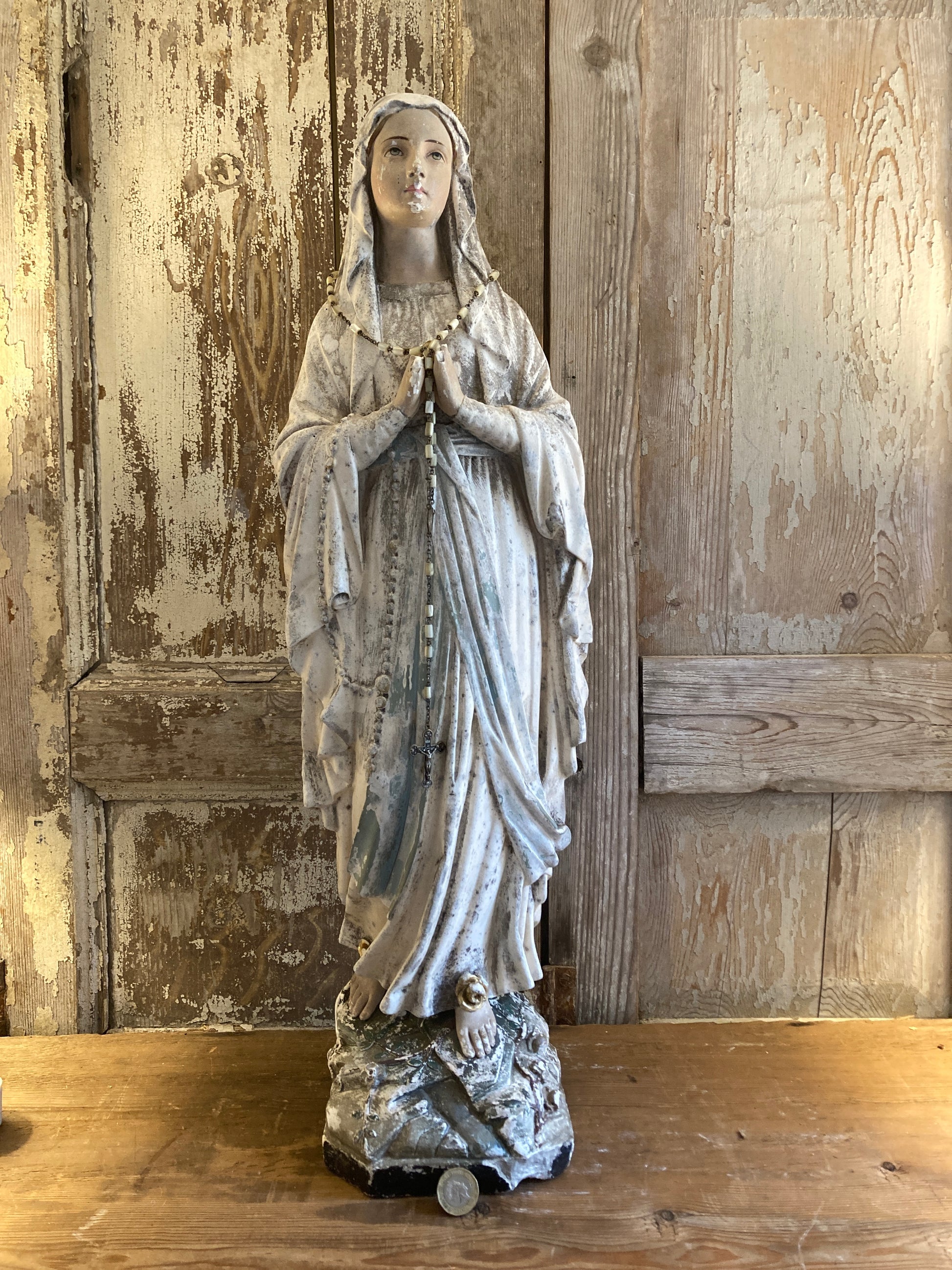 Large French Madonna religious statue with the most wonderful faded and muted colours. She still has gilt on her roses and echoes of gilt on her rosary.