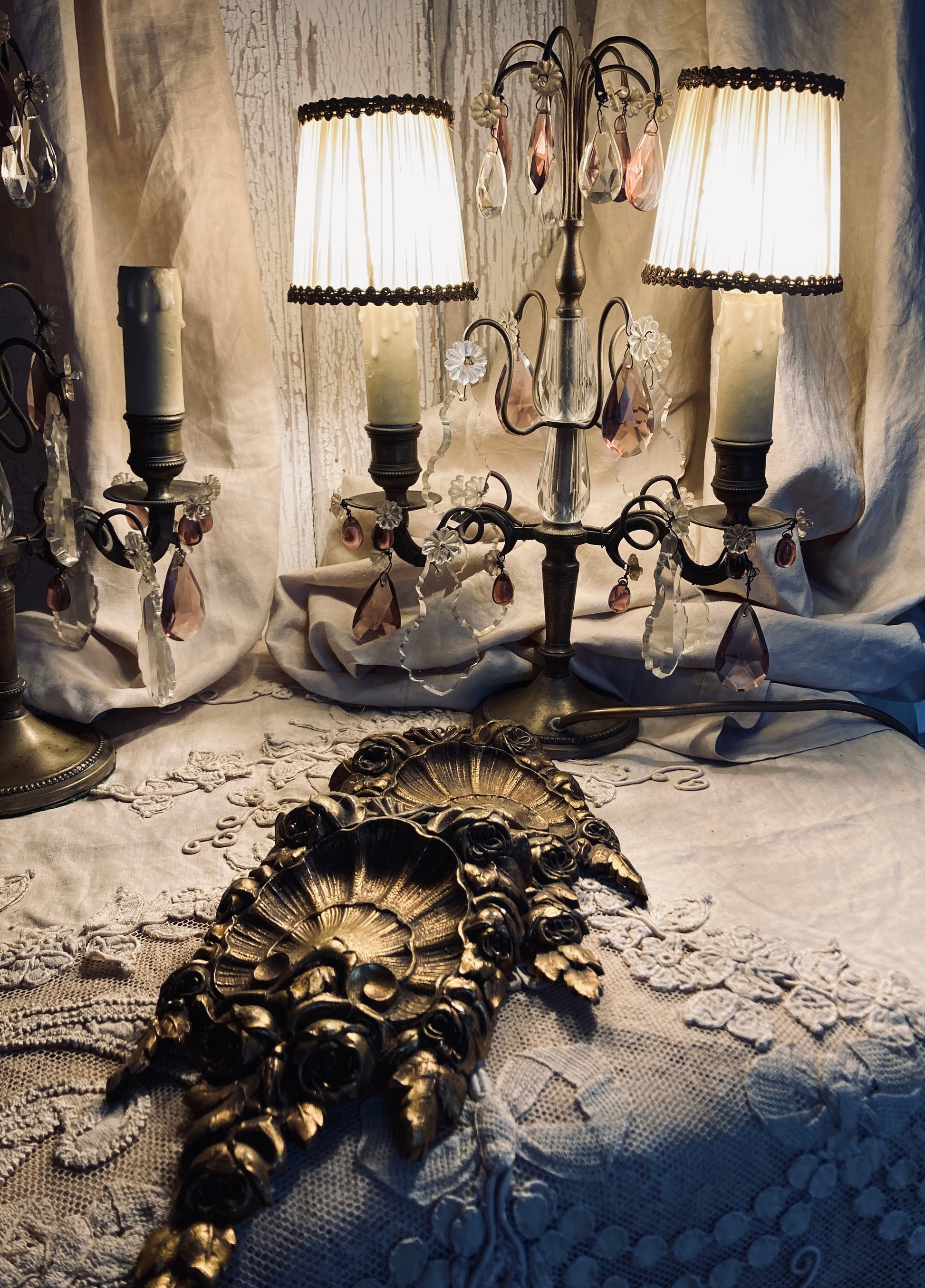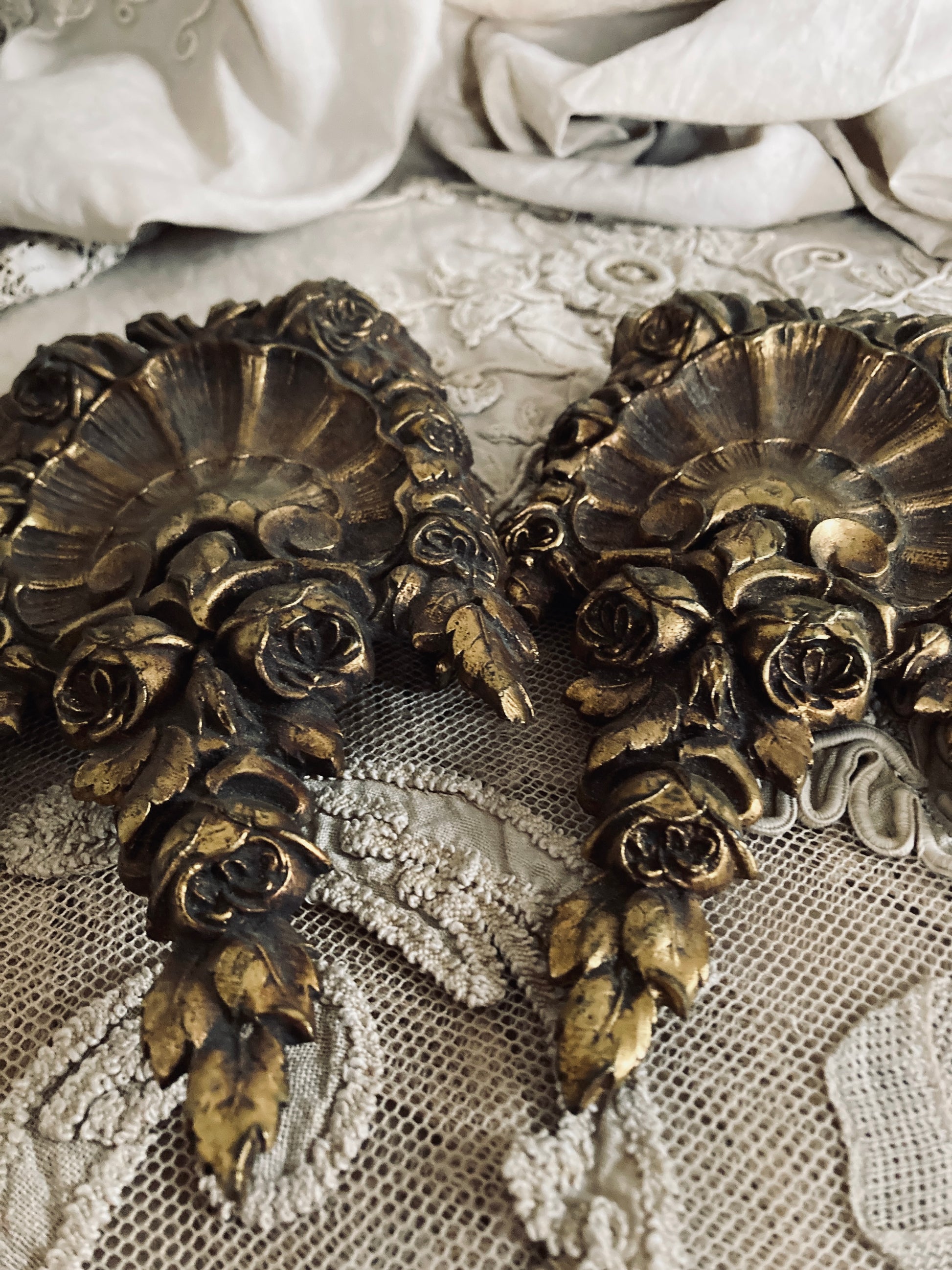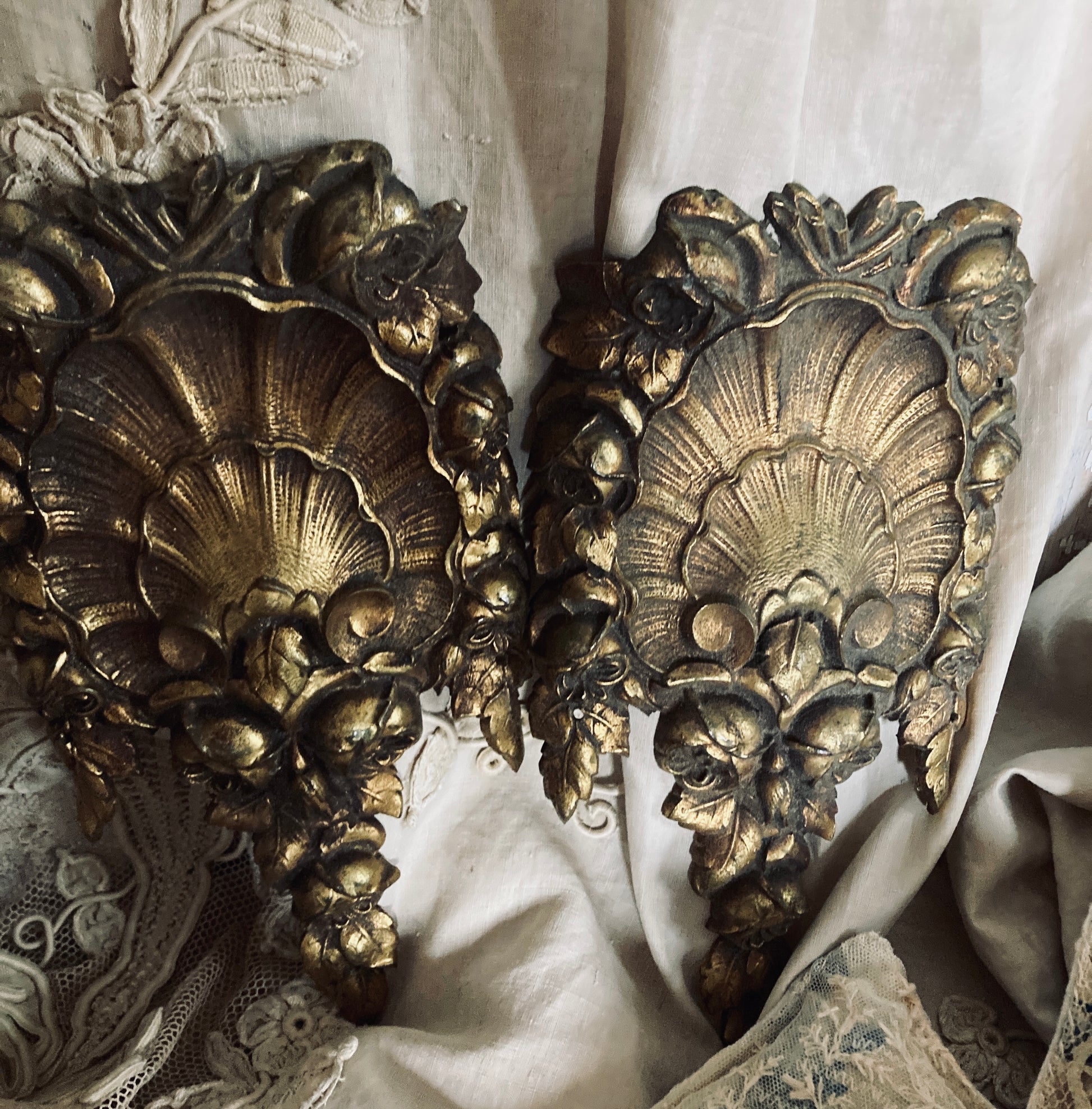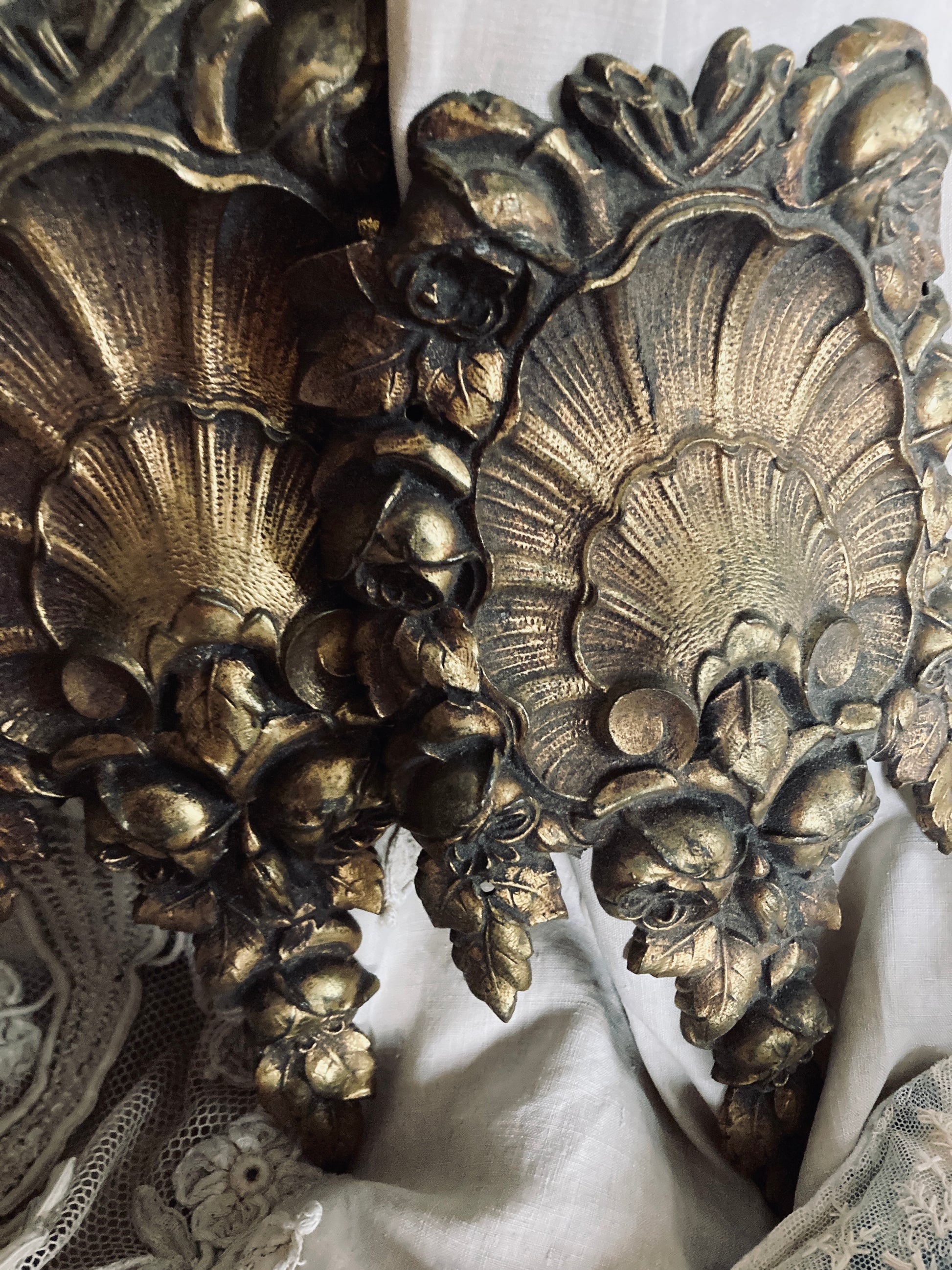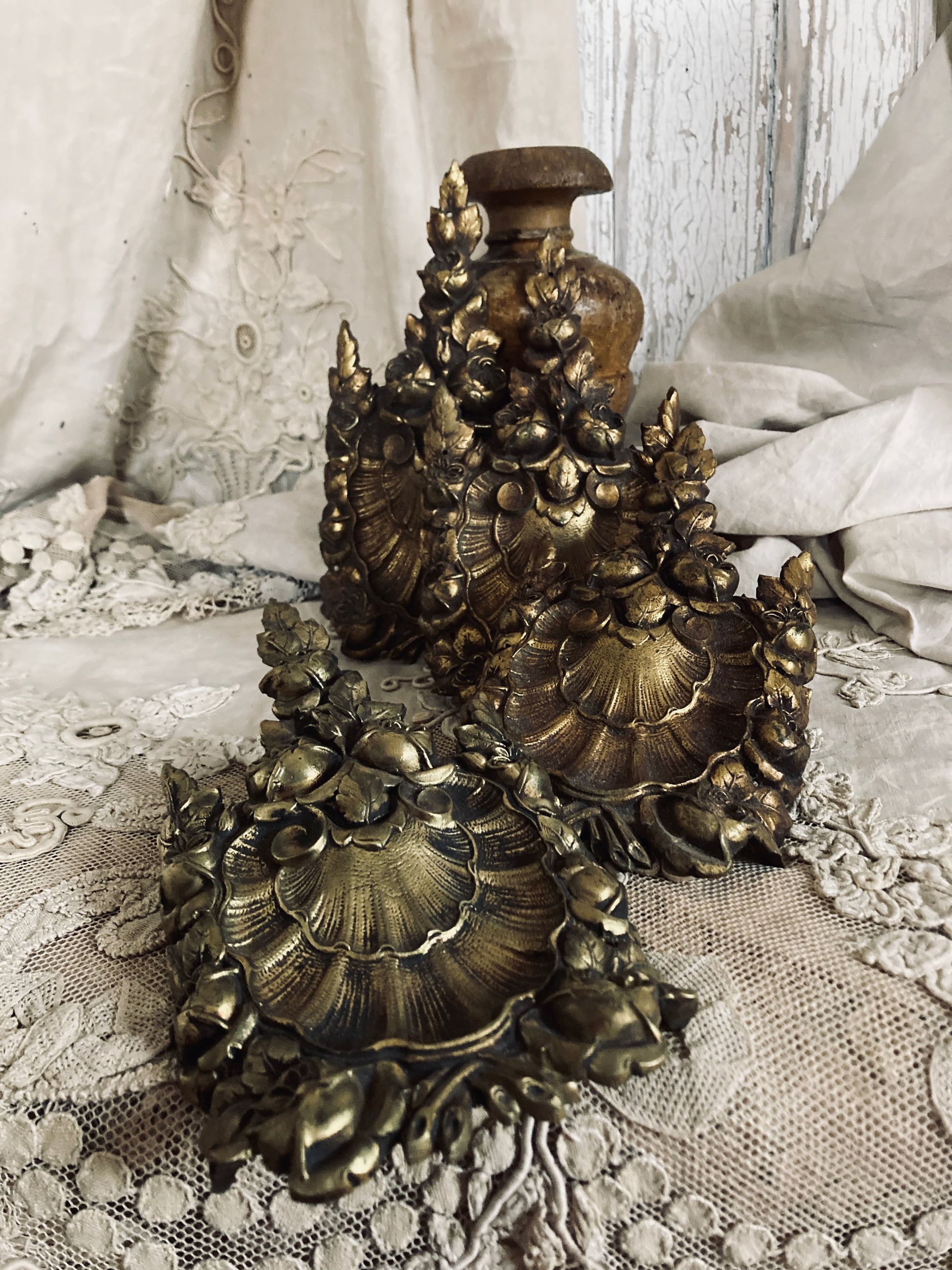 Beautifully cast, large french ormulu mounts. There are 2 pairs available and each one measures 21cms by 11.5 cms. Each has pin holes for attaching to a mirror/ armoir. I just love them as decorative items. Timeworn to a warm bronze.