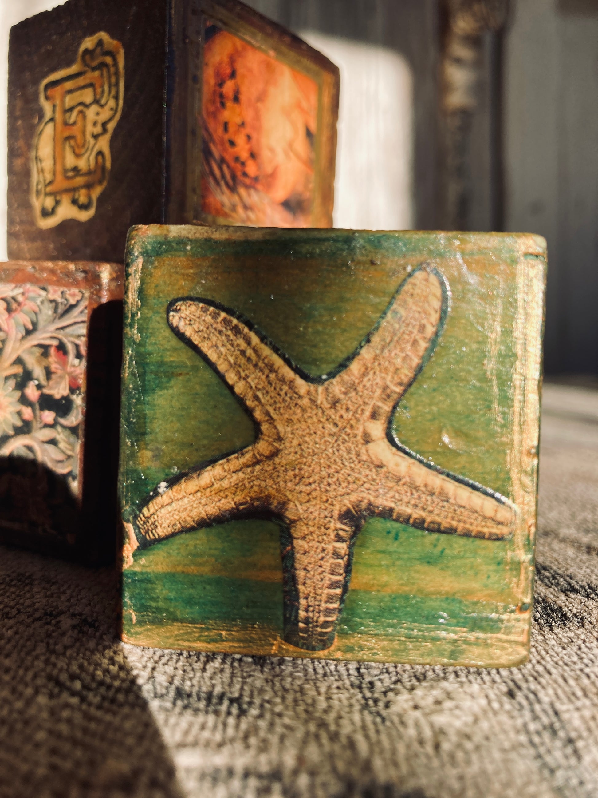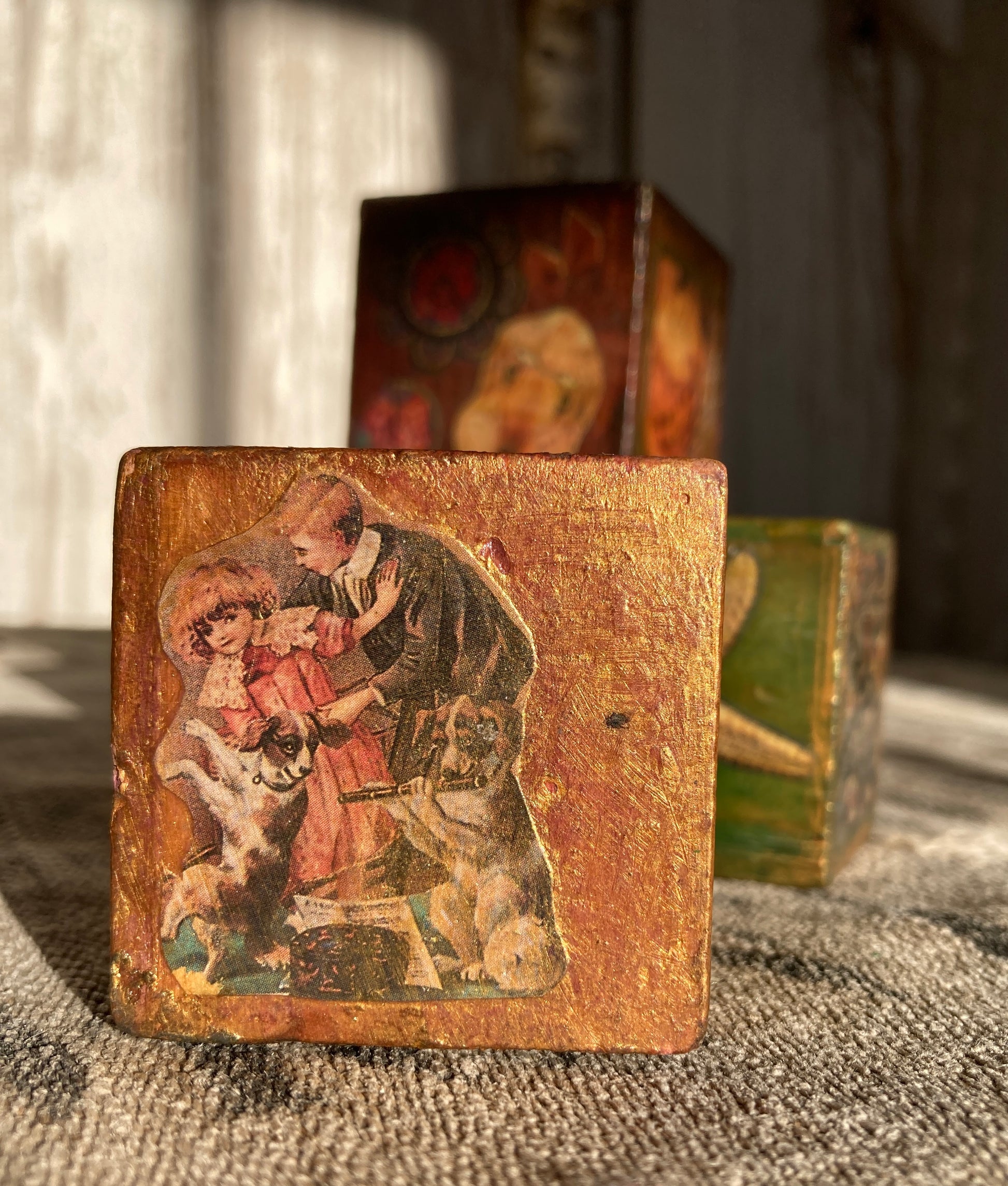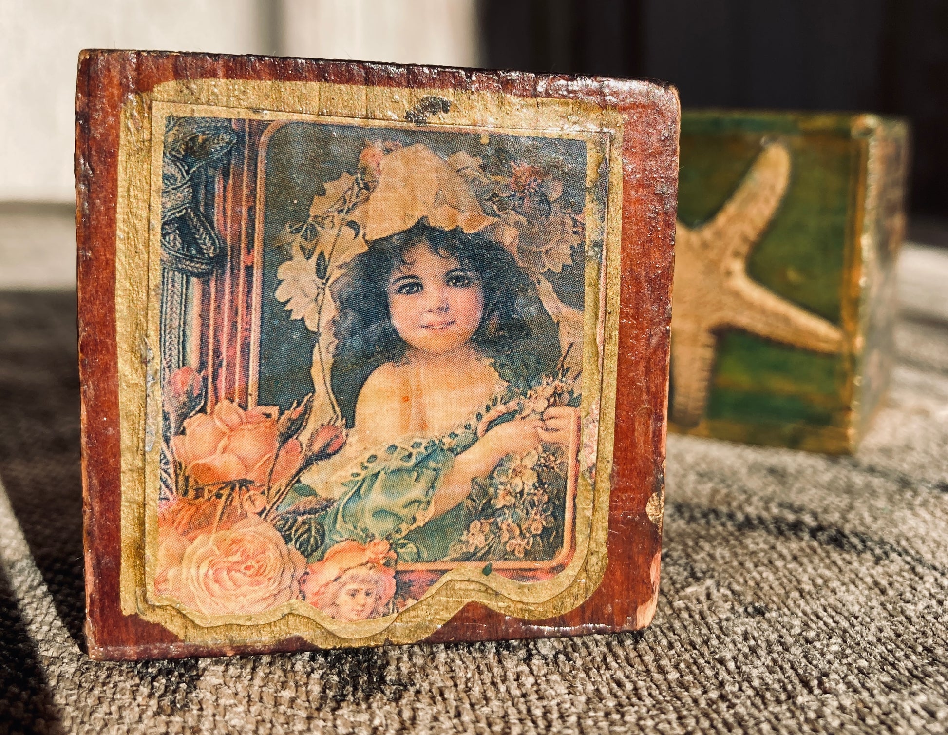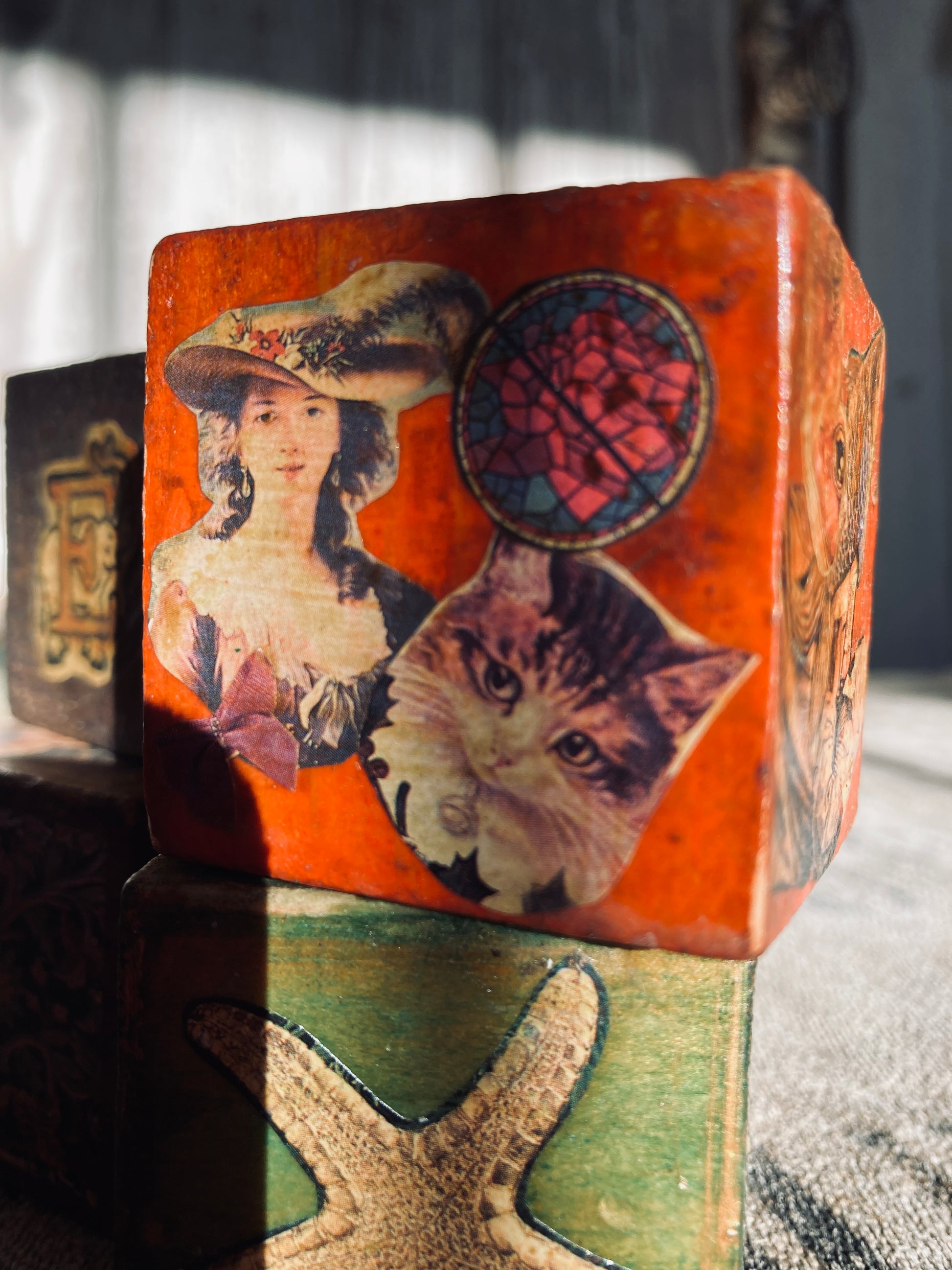 Oh how I love each of these 4 Victorian children’s blocks. The decoupage includes kittens, dogs, rabbits, starfish and so many more delightful echoes of Victorian England. Beautiful keepsake or gift.