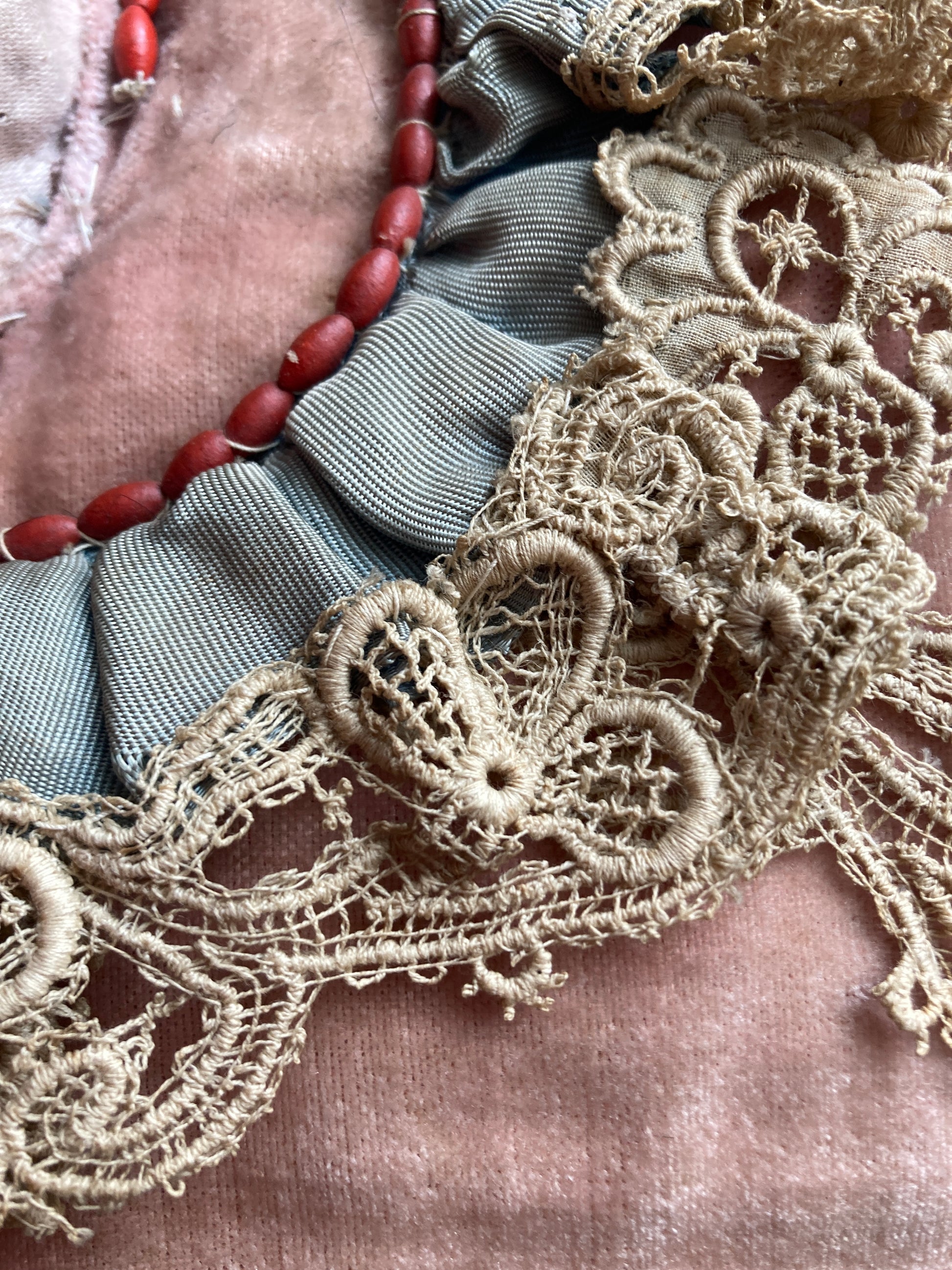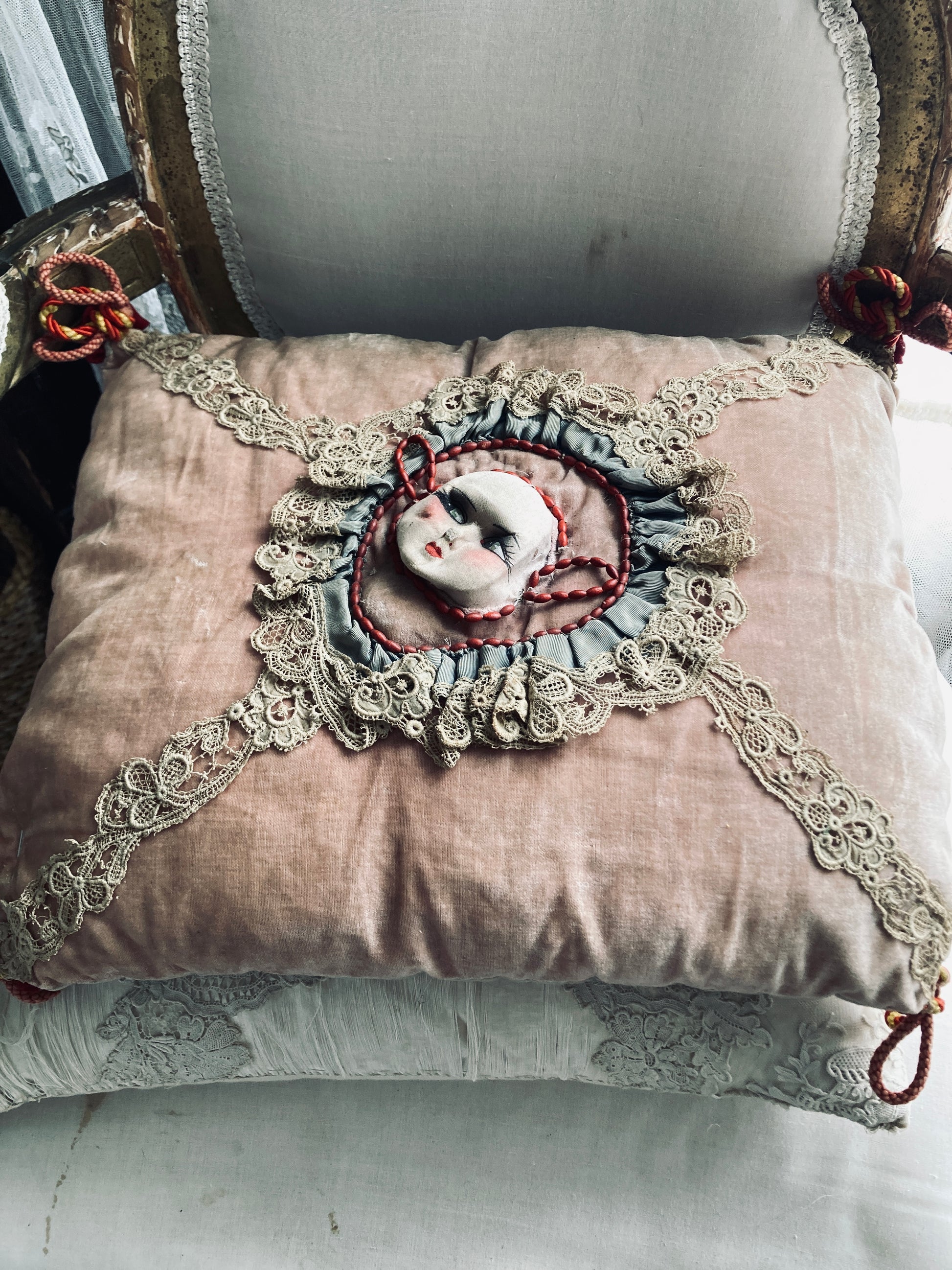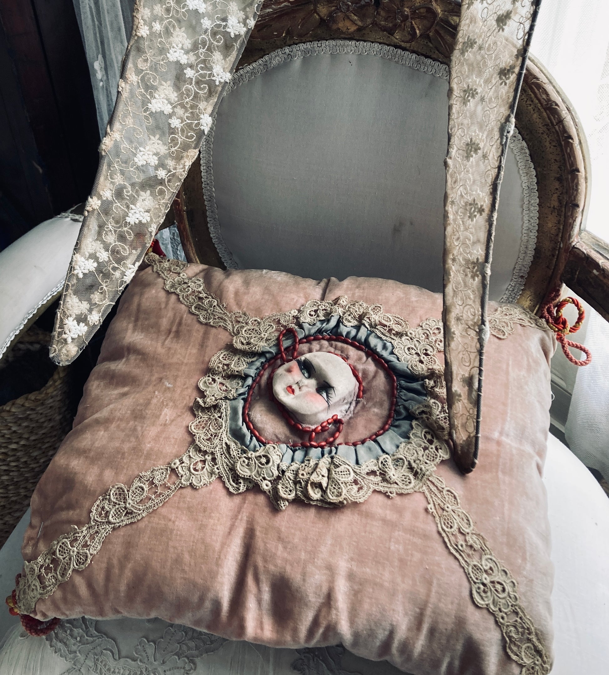 I fell in love with this 1930s handmade delight. It is a soft pink chenille and a pale eau de nil on the back. Hand made lace and a boudoir doll face in the middle. 5 of her beads are missing, some loose stitches and her face is flatter than it would have originally been but she is a gorgeous brocante piece and just charming!