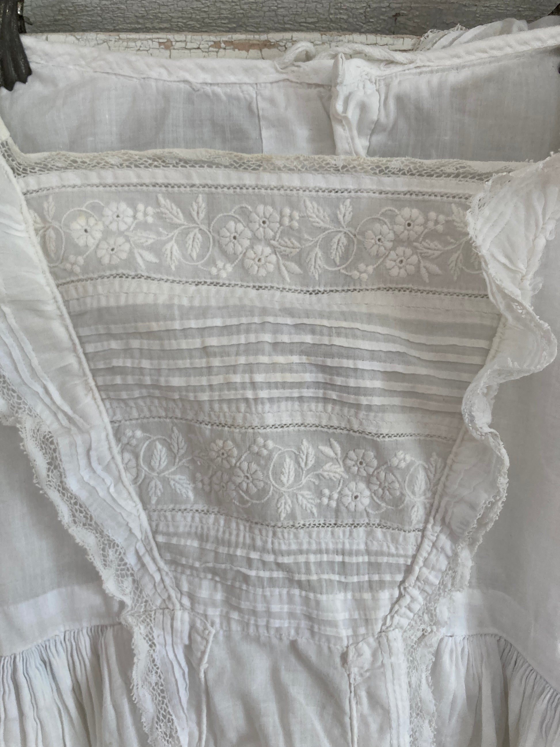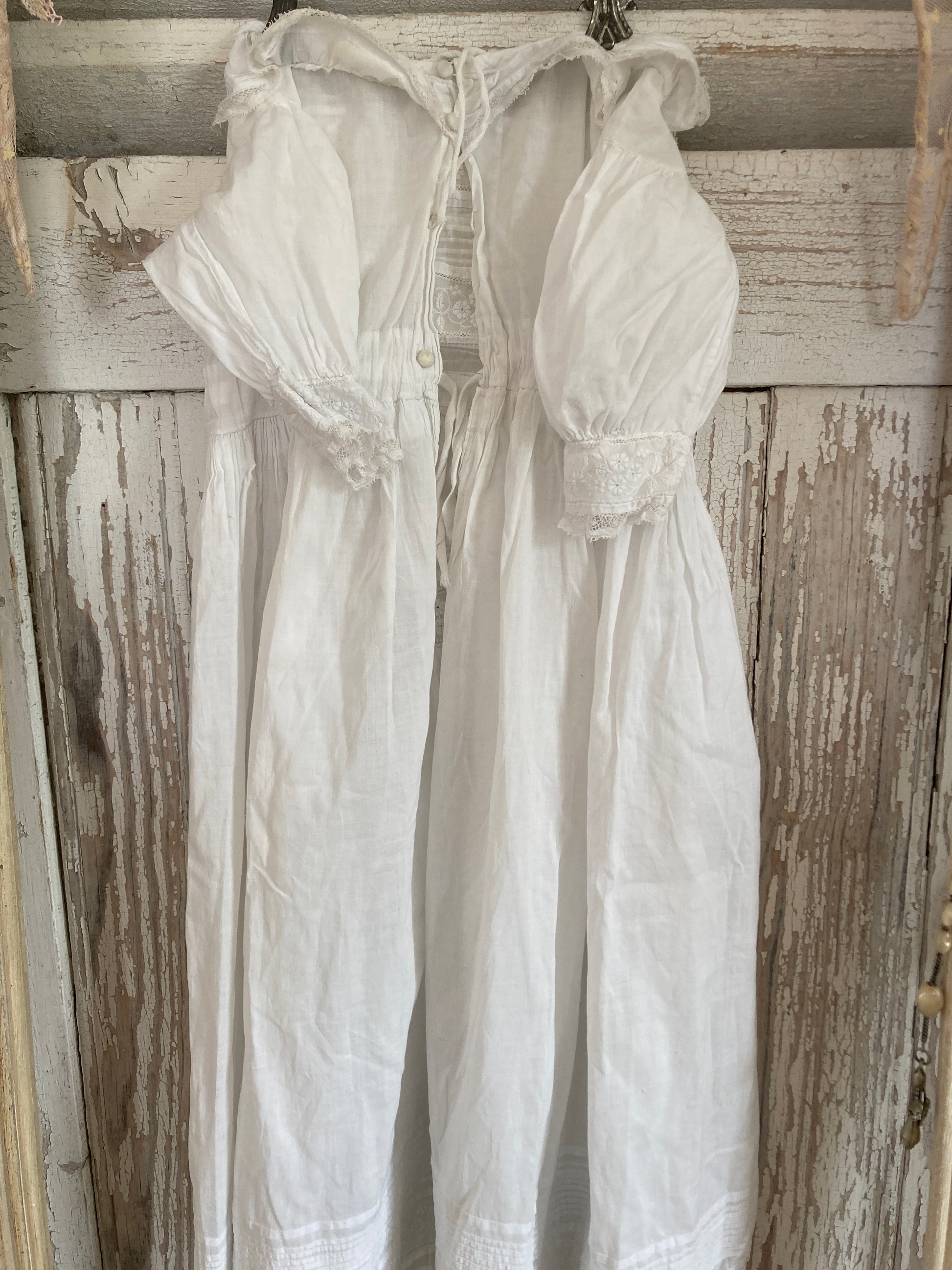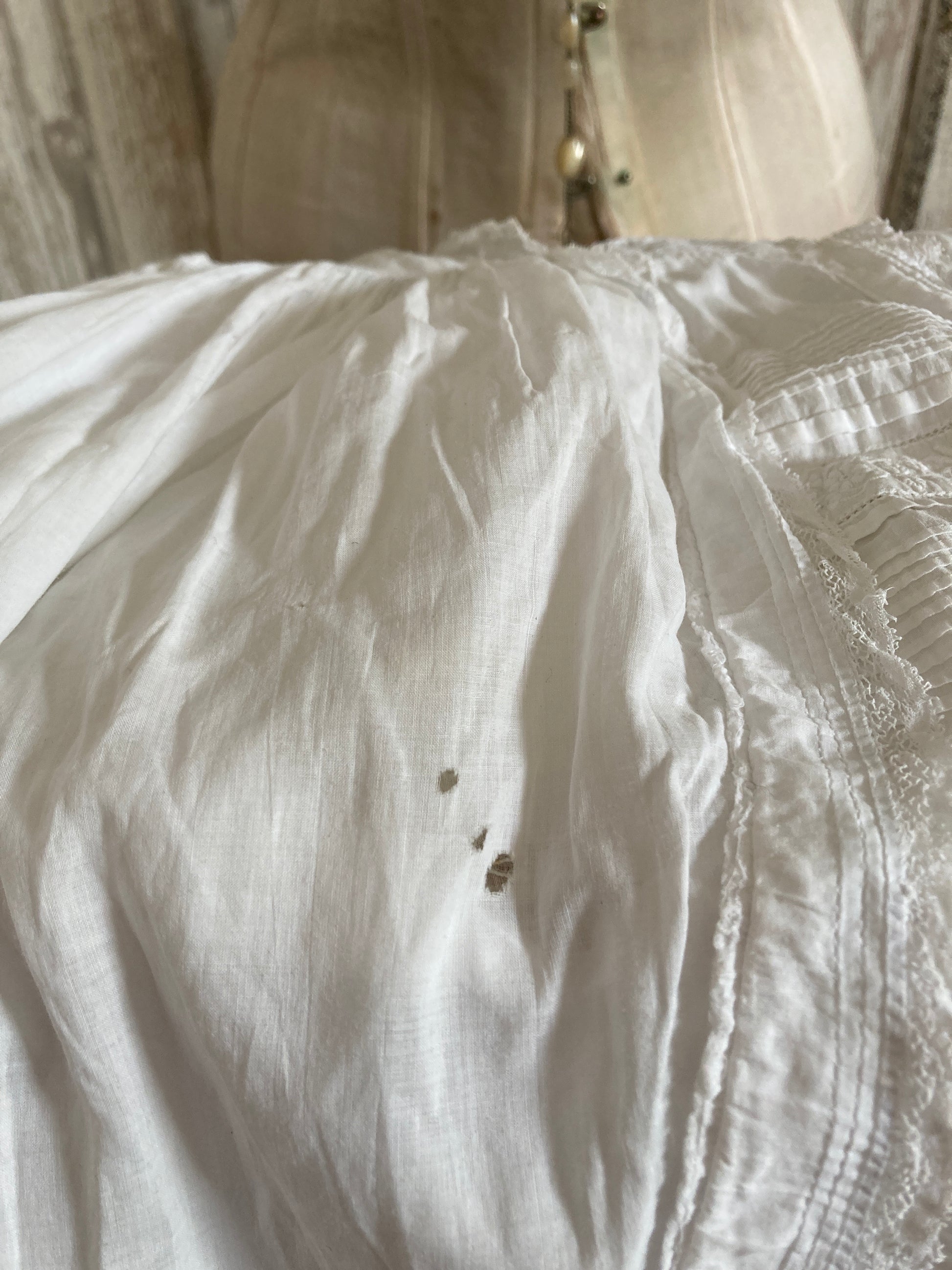 This little beauty is from Provence - gorgeous decorative gown in fine cotton. I just love the fabric covered buttons at the back. Some damage ( small holes as shown in the last picture) but this doesn’t distract and when hanging they get lost in the folds.