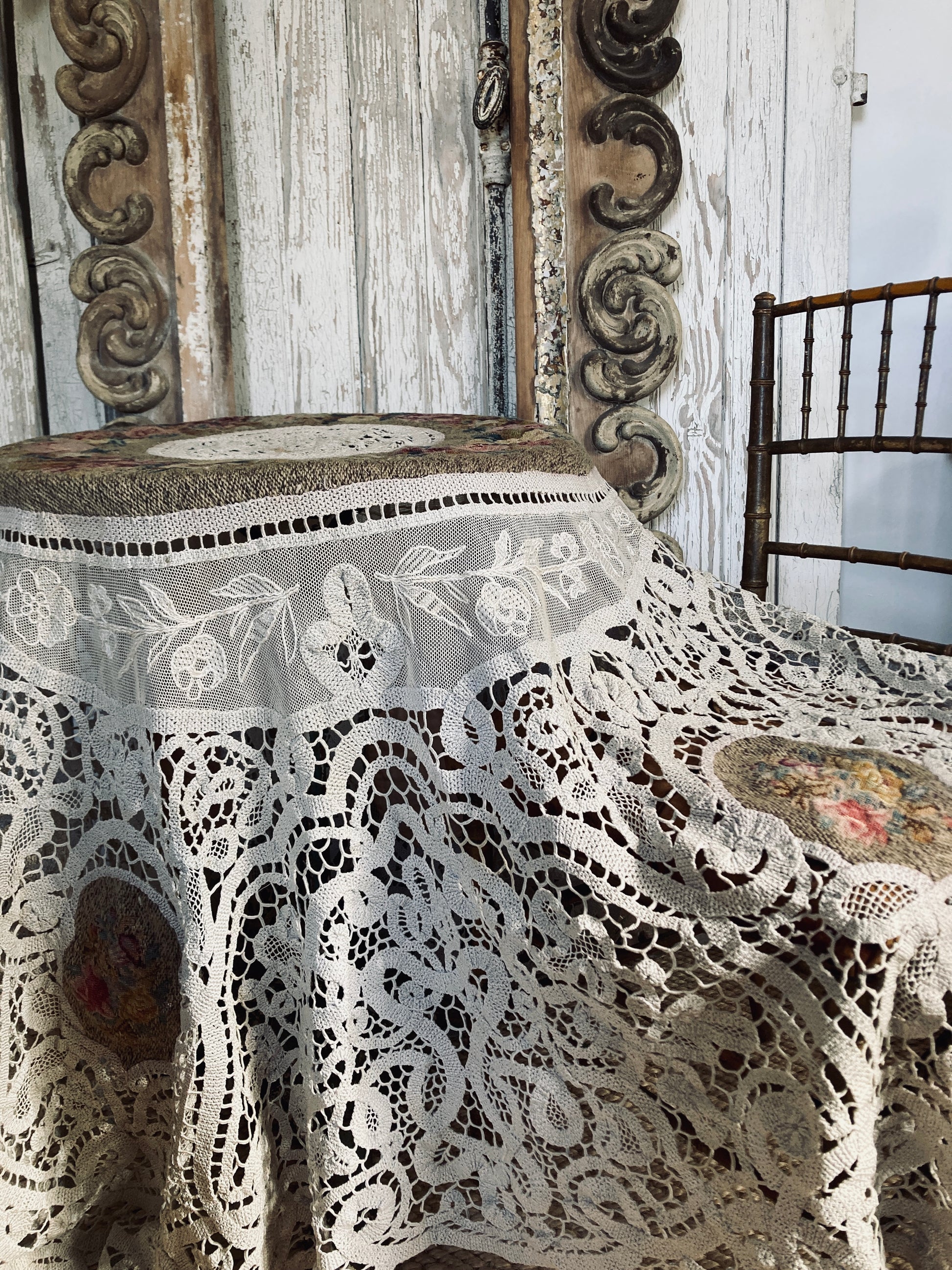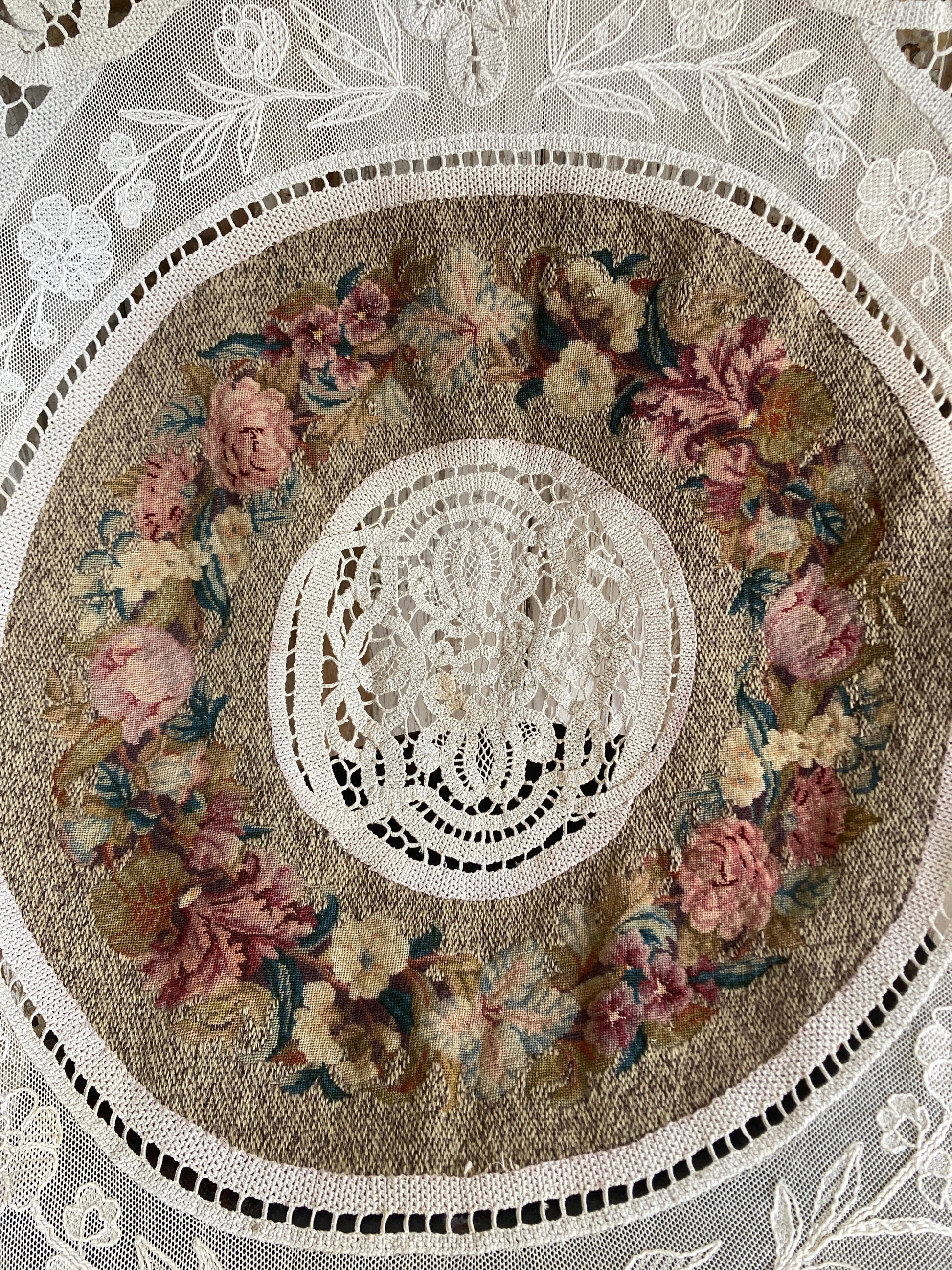 Glorious fine tapestry and crochet lace panelled table covering.