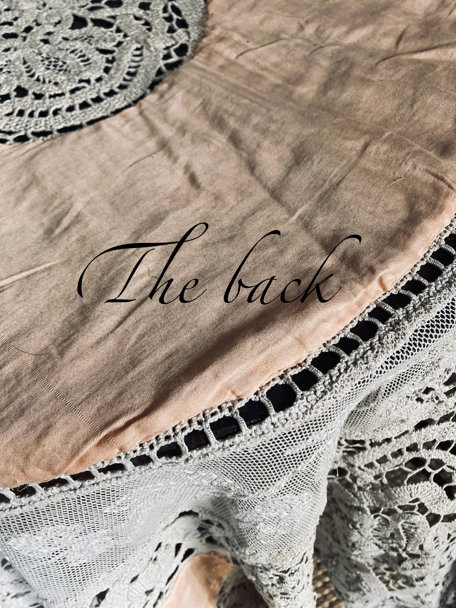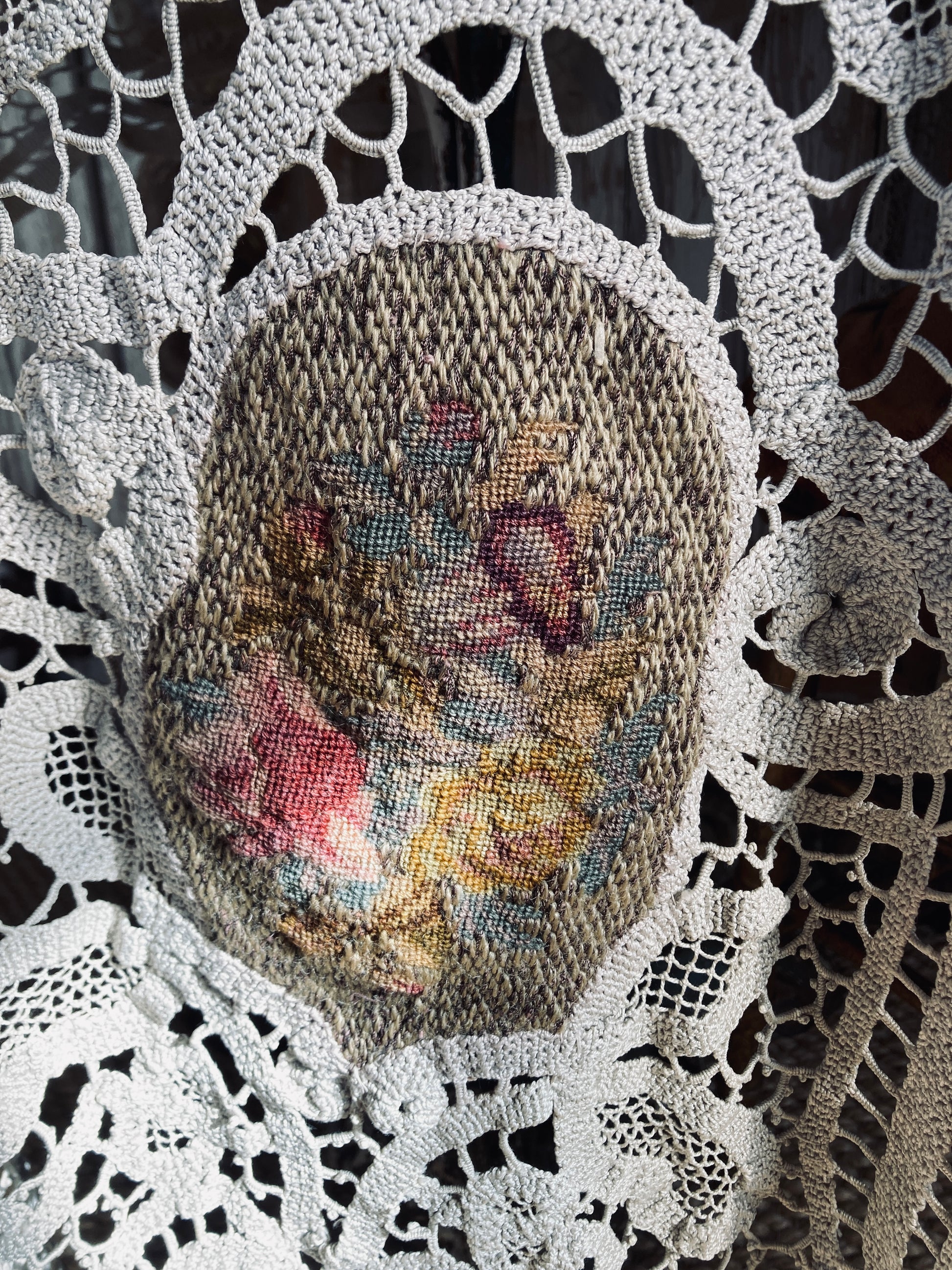 I have taken so many pictures of this antique piece because the detail and work that has been poured into this is breathtaking. The tapestry panels look to be aubusson and the thick crochet lace and fine handworked lace are equally beautiful. Nineteenth century fine craftswomanship.