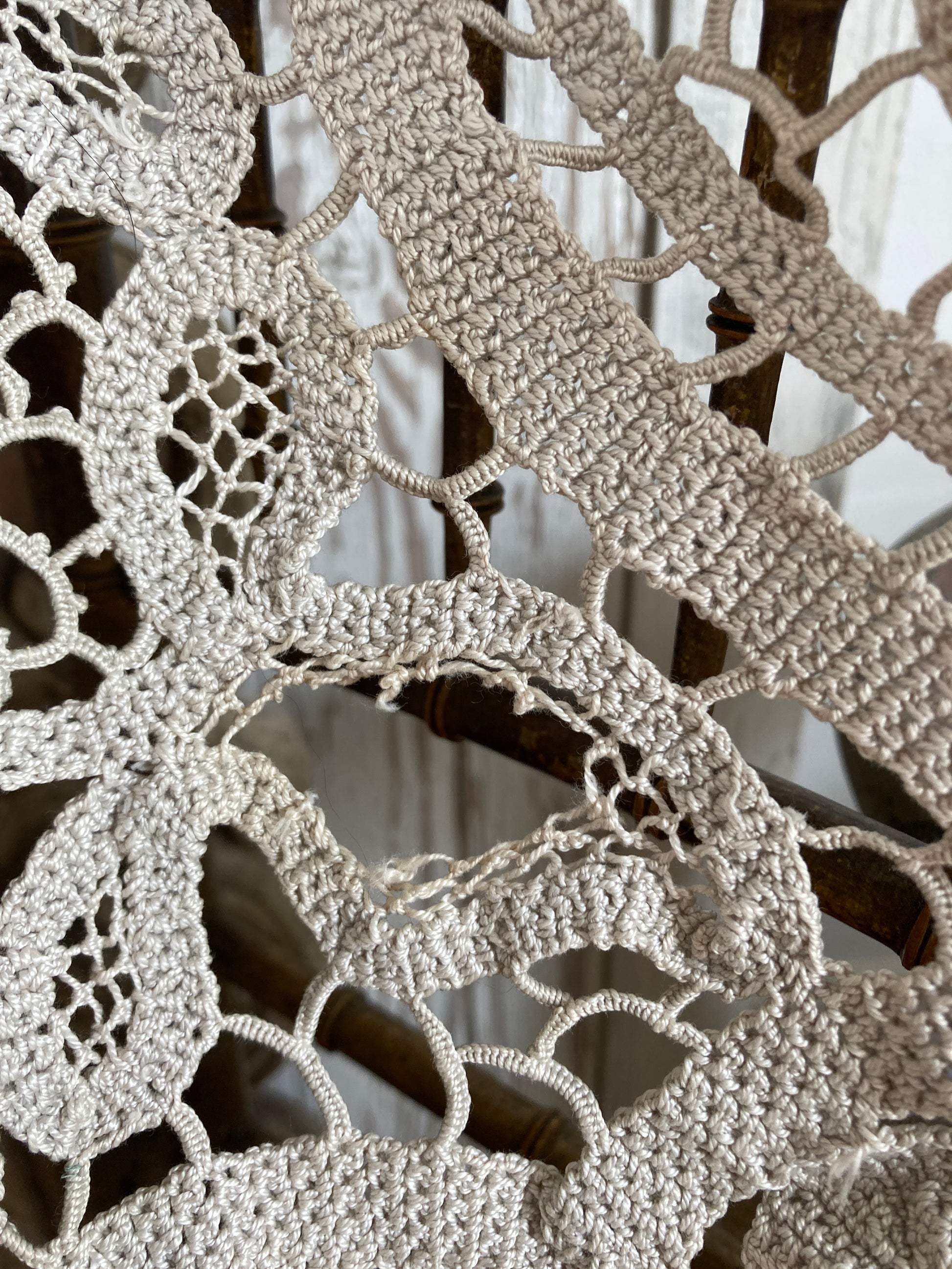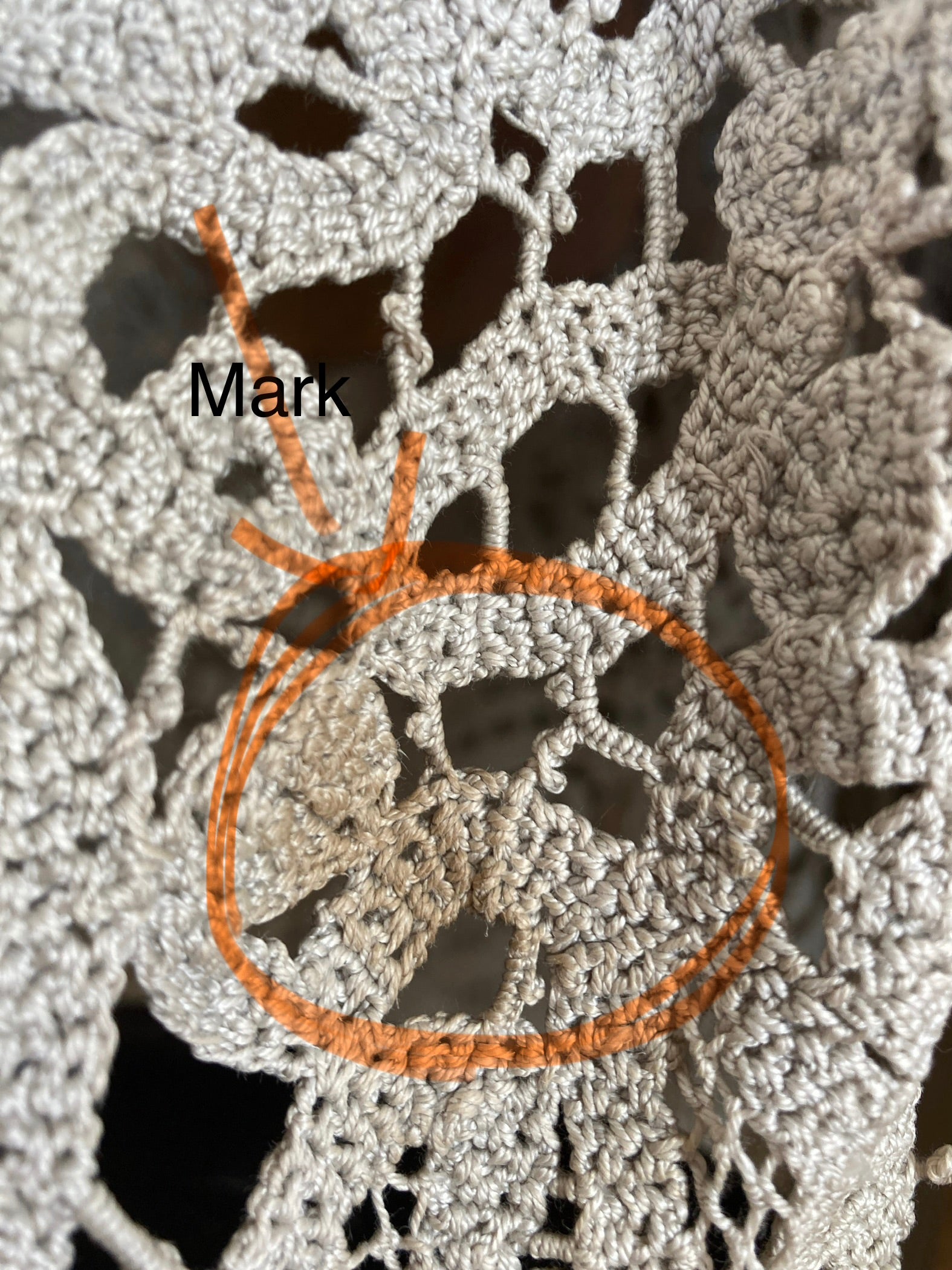 The last two images show a mark in the centre panel (which I have not tried to remove) and an area of missing crochet work.