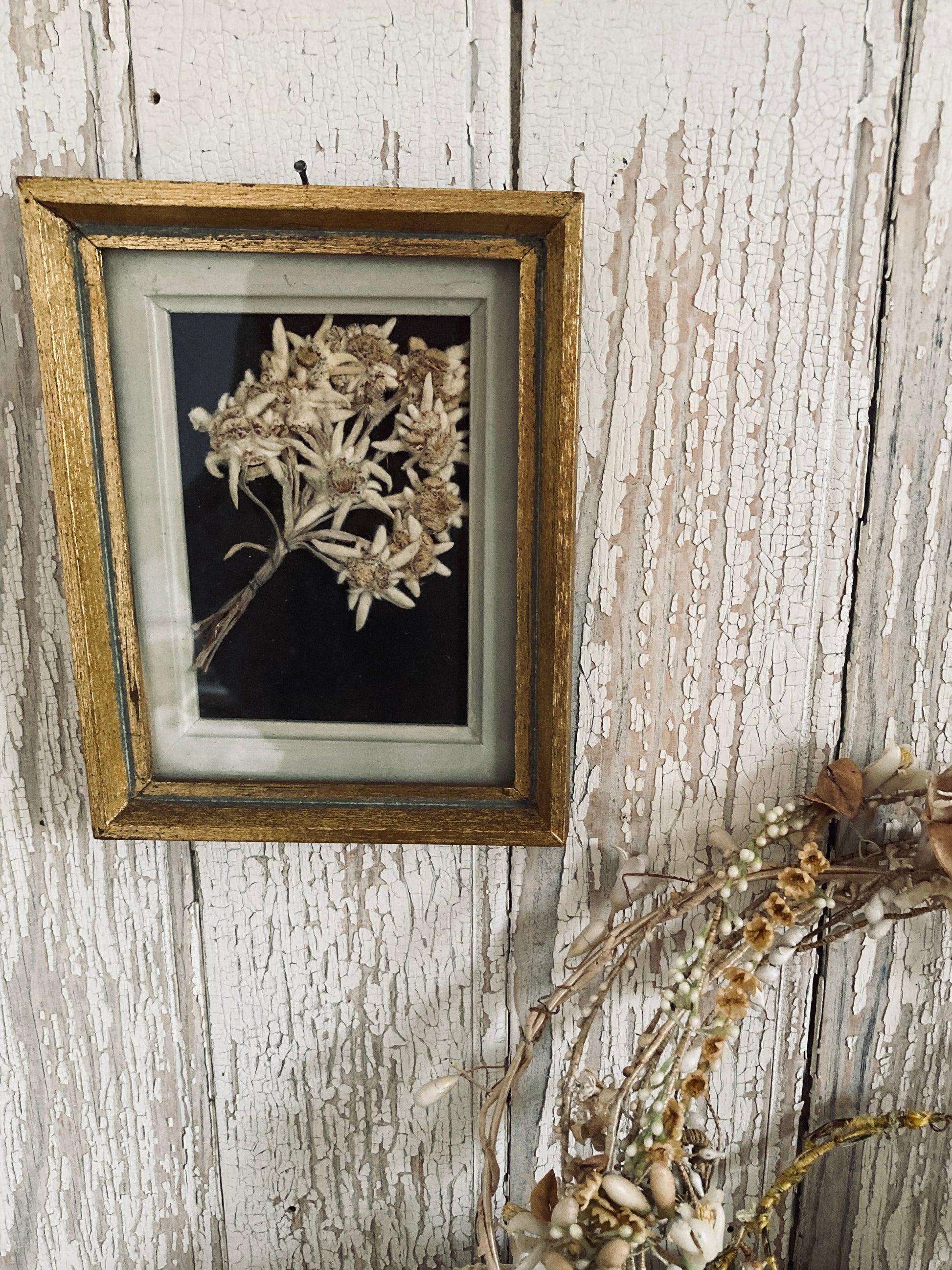 Such a pretty small framed dried Edelweiss arrangement. There is so much symbolism attached to this flower; purity, love and even courage as it struggles to bloom in the highest areas of the Alps.