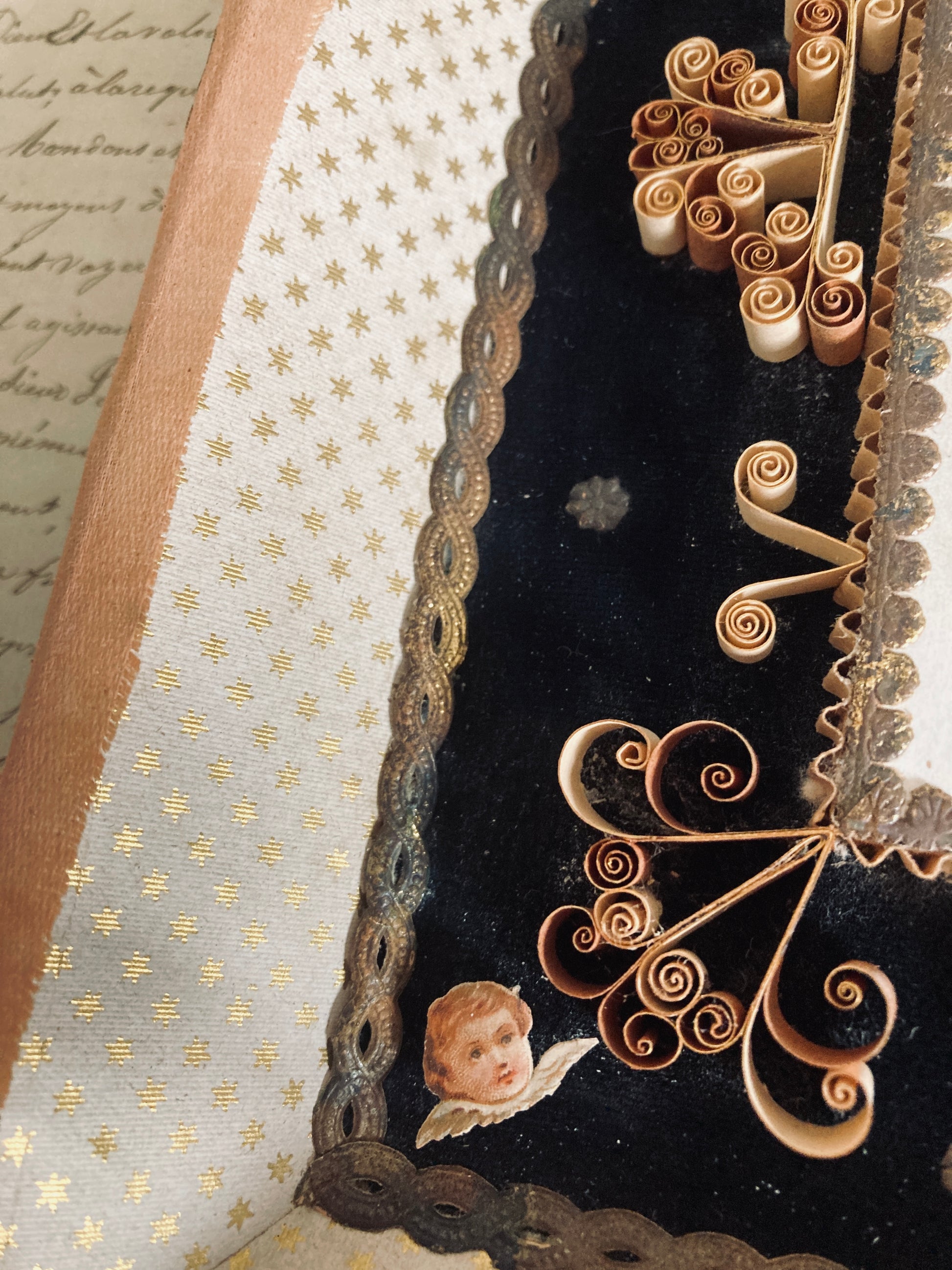 The quill work is as bright as the day it was made and the tiny star surround is textile. Now for the condition report. The glazed front is no longer attached to the deep frame. I haven’t tried to fix this and so at present, it can’t hang but the fact that the glass in not damaged is a little miracle in itself x